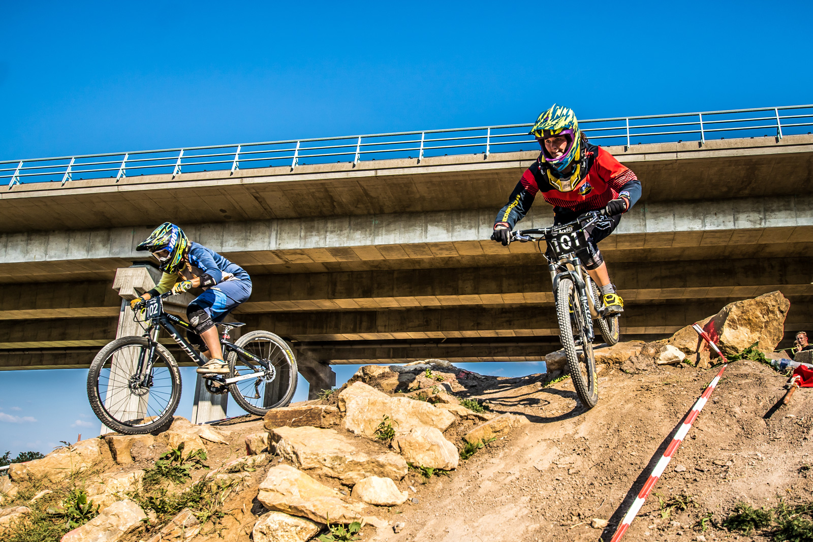 Verloren war aber auch für die Fahrer mit schlechteren Qualifikationsergebnissen noch nichts. In allen Klassen wurde auf das nächst größere Fahrerfeld aufgestockt, so dass jeder mindestens einen Rennlauf hatte. Die besser platzierten Fahrer zogen mit Freilos direkt in die nächste Runde ein. Außerdem wurden von Beginn an alle Rennpaarungen doppelt gefahren mit getauschten Spuren und addierten Zeiten – absolute Chancengleichheit also. Ab dem Viertelfinale griffen dann alle Klassen in das Renngeschehen ein, die Abstände wurden geringer und es entwickelte sich ein Dual Slalom Rennen, wie es Fahrer und Zuschauer lieben. Packende Heats, die oft erst auf der Ziellinie entschieden wurden, kaum Stürze und keine einzige ernsthafte Verletzung.