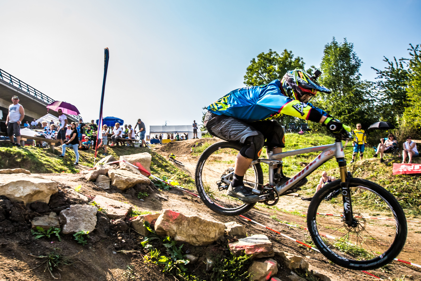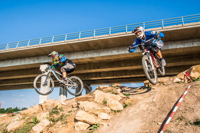 Nachdem die bewährte Dual Slalom Strecke in Winnenden seit ihrer Eröffnung 2009 fast unverändert blieb und Jahr für Jahr für spannende Rennen sorgte, war für 2016 dank einer Geländeerweiterung die Chance für ein komplett neues letztes Streckendrittel gekommen. Obwohl es Bedenken gab, den einzigartigen, flowigen Streckencharakter zu verlieren, entschied man sich für eine Streckenführung mit Steinfeld und offenem Wiesenstück. Dass die Strecke dadurch wenig von ihrem Flow eingebüßt hat und den Fahrern mit neuen Herausforderungen umso mehr Spaß machte, zeigte sich bereits im freien Training am Samstagnachmittag. Die verlängerte Fahrzeit auf 30-40s sorgte allerdings auch dafür, dass die Fitness eine nicht zu unterschätzende Rolle spielen sollte, wenn man auf der langen Zielgeraden nochmal angreifen wollte. Nochmal ein paar extra Meter Streckenlänge bekamen die U11-Fahrer, die zum Teil noch auf 20“ unterwegs sind und für die deshalb eine Variante ohne Steinfeld gesteckt wurde.
